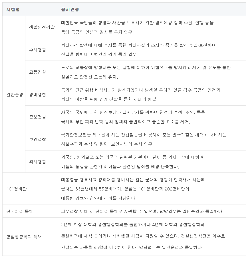 - 과목 구성:형법,형사소송법,경찰학개론,헌법,범죄학 (일부 지역에서 한국사 포함)