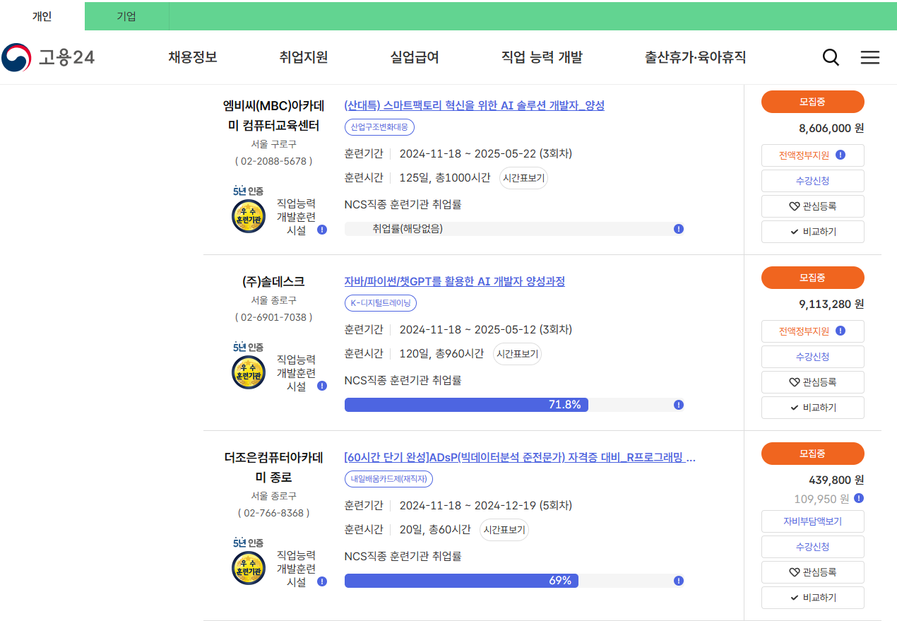 - 지원 대상: 실업자, 재직자, 중장년층 등.
