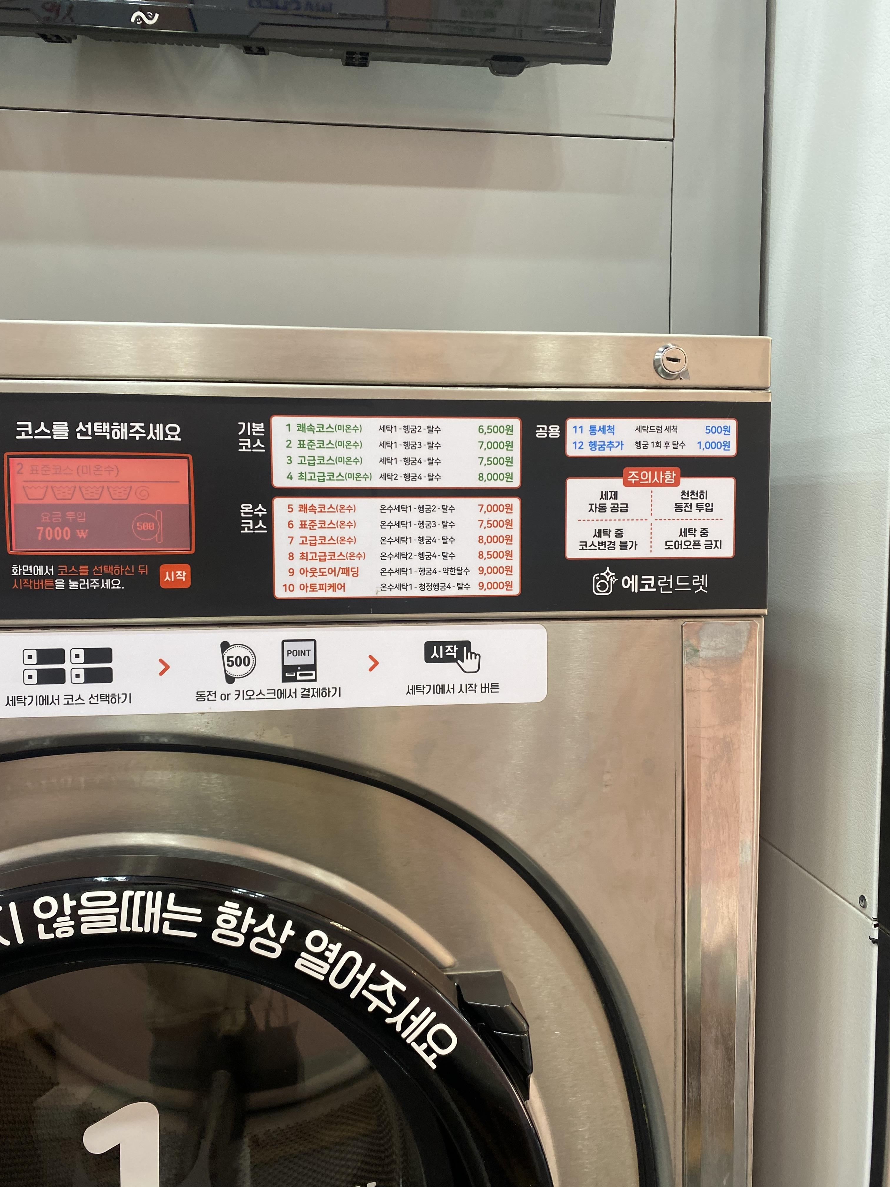 - 동전세탁소에 도착하면 사용 가능한 세탁기를 확인하고 선택합니다.